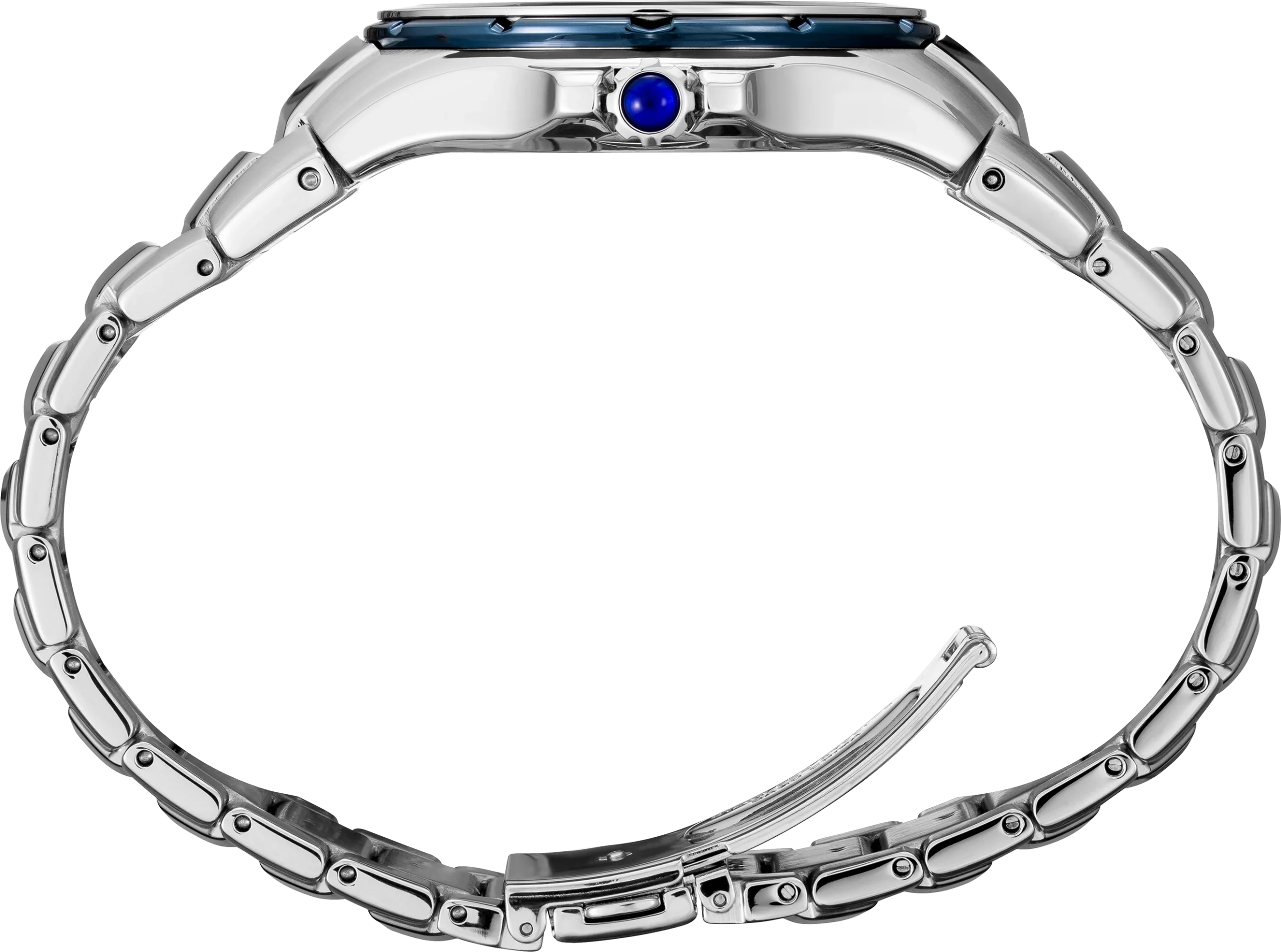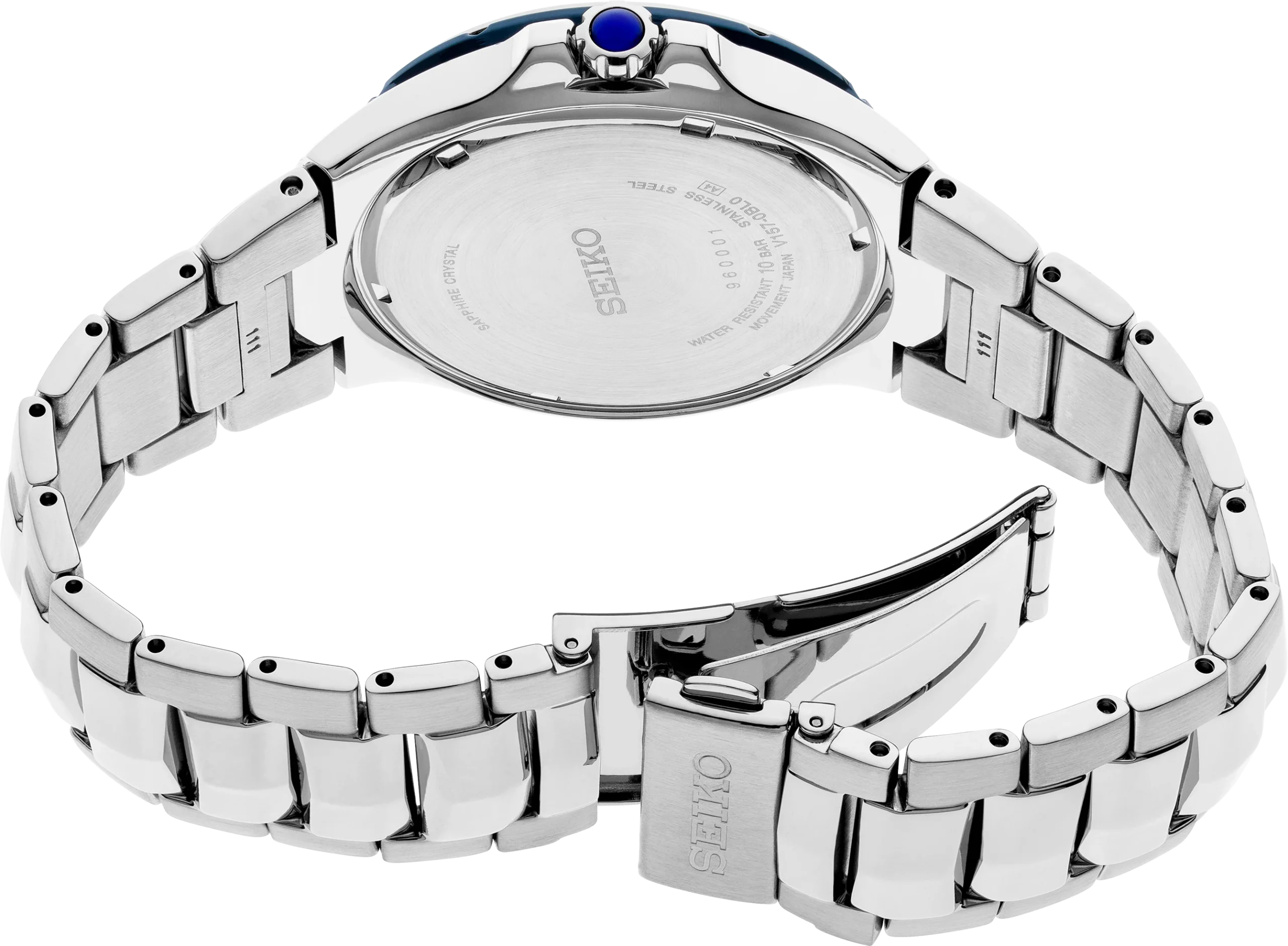 From the Coutura Collection. Delivering the Seiko Watches perfect blend of sport and style for those on the move, Coutura is crafted for effortless timekeeping excellence. The newest designs offer fresh color variations with pops of contrast and an emphasis on modern luxury. Included is this sophisticated timepiece anchored by a gray dial with blue accents, date calendar and LumiBrite hands and markers, plus a bezel with blue ion finish. Crafted of stainless steel, with vigorously SNE565 angular lines, this versatile watch includes a screwdown caseback, sapphire crystal and cabochon crown. Powered by any light source, with no battery change required, the energy-efficient solar cell provides a 10-month power reserve when fully charged. 10 bar, 100M Water Resistant