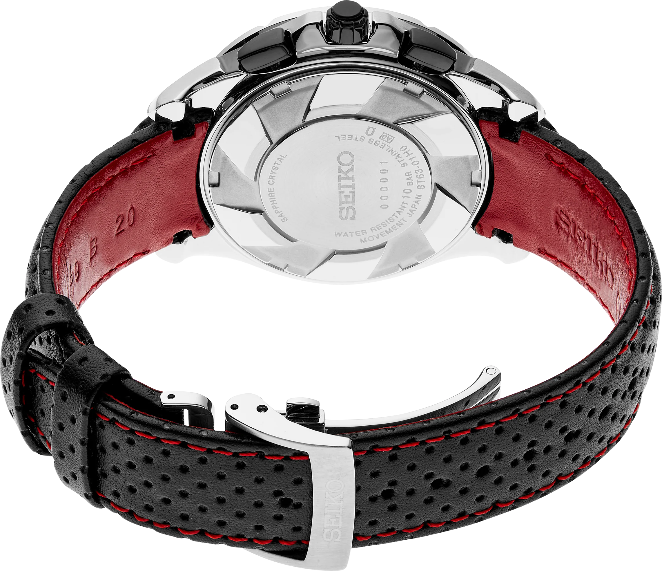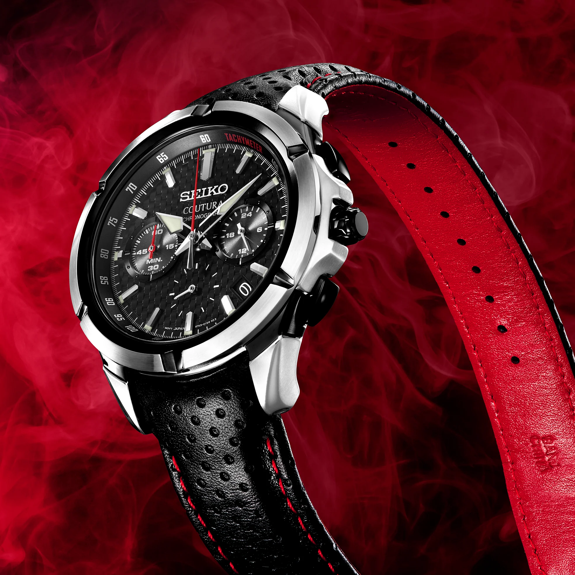 From the Coutura Collection. Delivering the perfect blend Seiko Watches of technology and design for those on the move, the Coutura Collection combines bold angularity and shading with superior timekeeping for effortless sport/dress style. Inspired by motor sports, with a new case design incorporating the angles and edges of racecar architecture, this dashingly sculpted chronograph features a multi-layer carbon-fiber patterned black dial styled to suggest a dashboard, with prominent 24-hour and chronograph minute subdials at 3 and 9 o’clock, tachymeter outer ring, date calendar, and LumiBrite hands and markers. Applied markers and subdial rings add a rich dimensionality, while the black accents punctuating the bezel provide a sense of propulsive action. Designed to echo driving gloves, SSB437 the black perforated leather strap includes red contrast stitching and a tri-fold push button release clasp. With a stainless steel case, this dynamic watch includes a sapphire crystal, screwdown caseback, and classic cabochon crown. The chronograph function offers timing to 60 minutes in 1/5-second increments with split time measurement. 10 bar, 100M Water Resistant