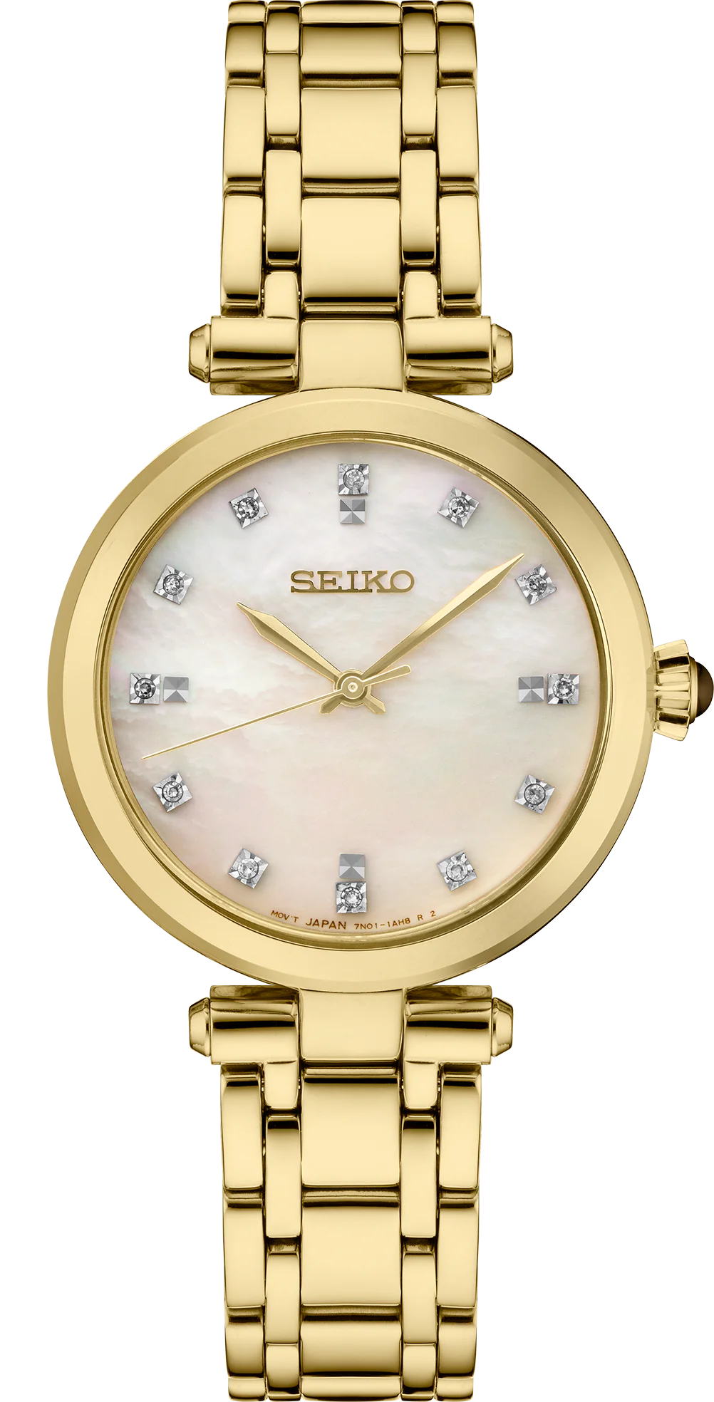 From the Diamond Collection. Designed to dazzle – the Diamond Collection provides the perfect dash of brilliance for any occasion. Offering an elegant jewelry-inspired look, this sophisticated design features a mother-of-pearl dial with gold hands and 12 diamond markers. Crafted of stainless steel, with gold finish, classic cabochon crown, and a sapphire crystal for superior scratch resistance. 5 bar, 50M Water Resistant