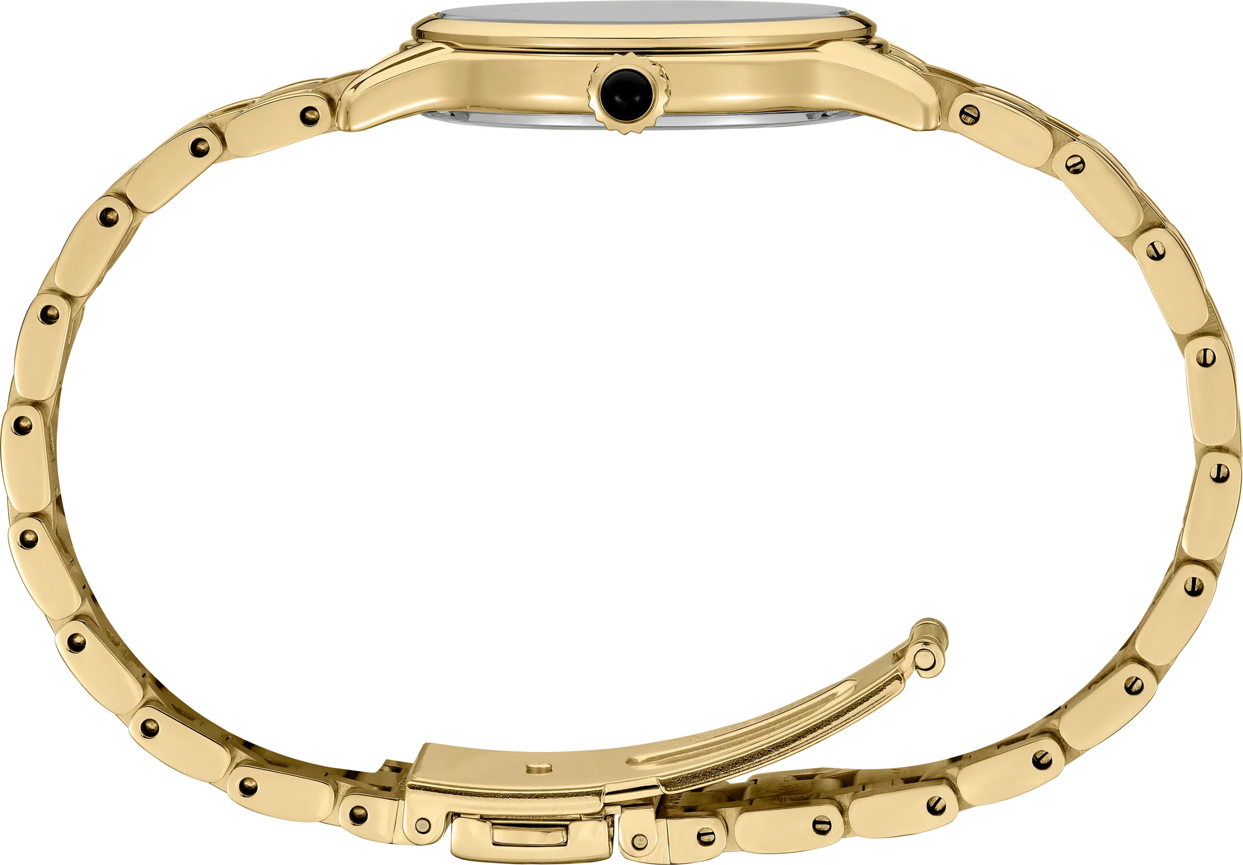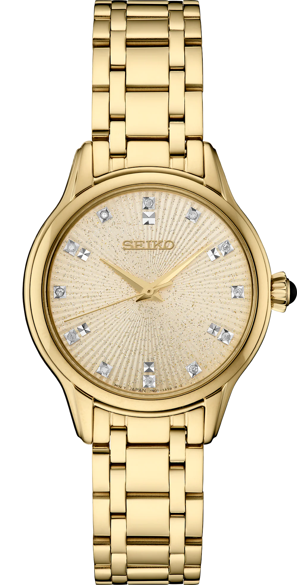 Seiko SRZ552 is a ladies’ quartz wristwatch from the Seiko Diamond series. This timepiece comes in a 29.5mm case made of gold-plated stainless steel, sapphire crystal glass, 5-bar water resistance, and 12 diamonds in a champagne face.