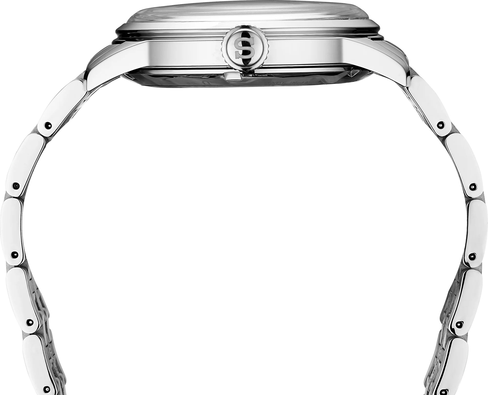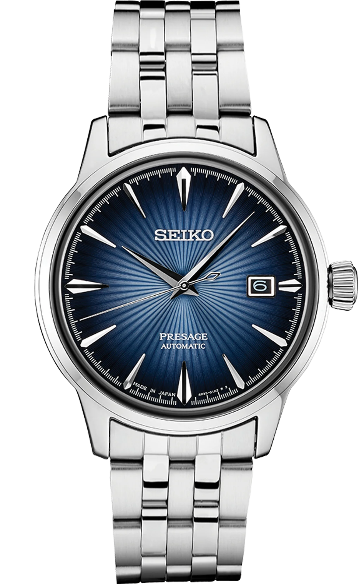 Seiko Presage Automatic. This SRPB41 refine men’s watch is designed with a stainless steel case and bracelet. The dial features a blue deep, pressed pattern whose shimmering beauty is enhanced by seven layers of gloss finish and the clarity of the box-shaped crystals. The hands are delicately curved by skilled craftsmen and women to give the watch case a slimmer profile. When turning the uniquely shaped crown, you can feel the strong torque of the winding mechanism. Automatic movement allows self and automatic winding capabilities and features 21,600 vibrations per hour, with a power reserve of approximately 41 hours, as well as 23 jewels. 50M Water Resistant